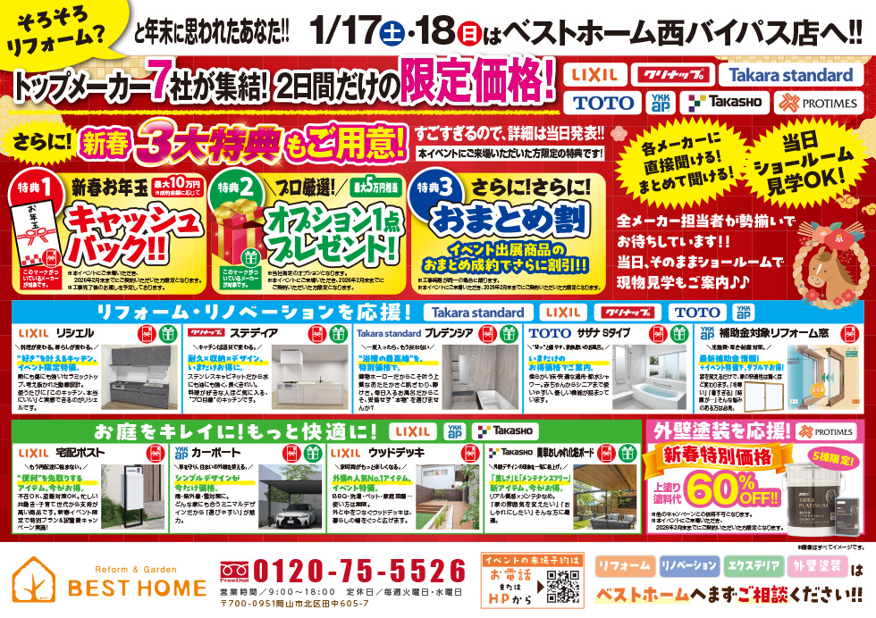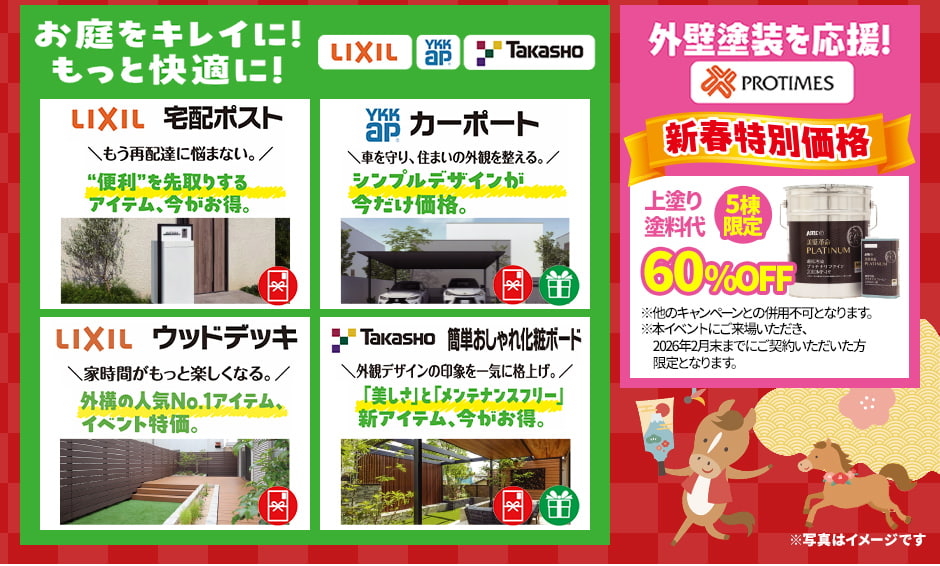 新年限定!限定価格リフォームをご用意!キッチン・お風呂・窓・外構・外壁塗装まで、人気メーカーの商品をイベント特別価格でご案内いたします。