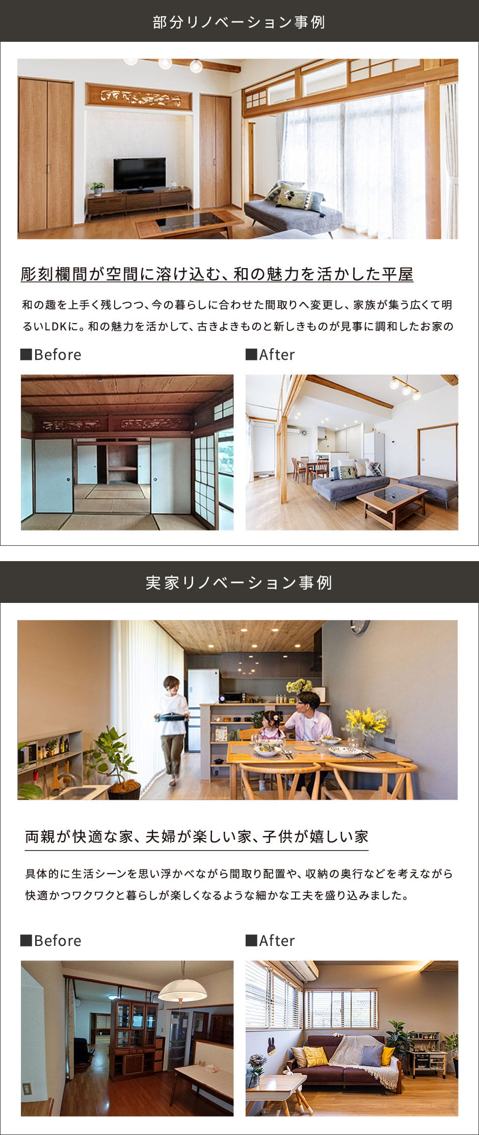中古住宅として購入し30年以上住んでこられたお家を、建て替えかリノベーションかで悩みご相談をいただいたいのがきっかけでした。お気に入り箇所は残しながら主な生活スペースに絞っての部分リノベーションとすることで、予算を抑えつつも安心して暮らせる暖かく快適なお家へと生まれ変わりました。実際に住んでみて、外の音が気にならなくなり快適に暮らしていると嬉しいお声もいただいております。