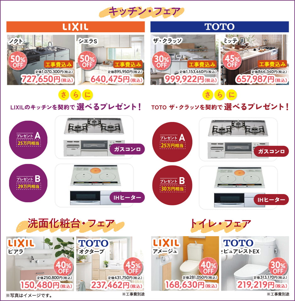 キッチン・洗面化粧台・トイレのお得な商品も多数ご用意!