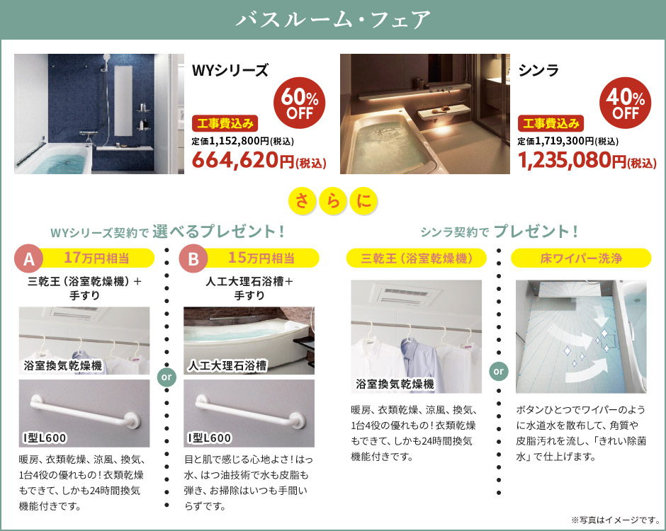 バスルーム以外にも、キッチン・洗面化粧台・トイレのお得な商品も多数ご用意しています!