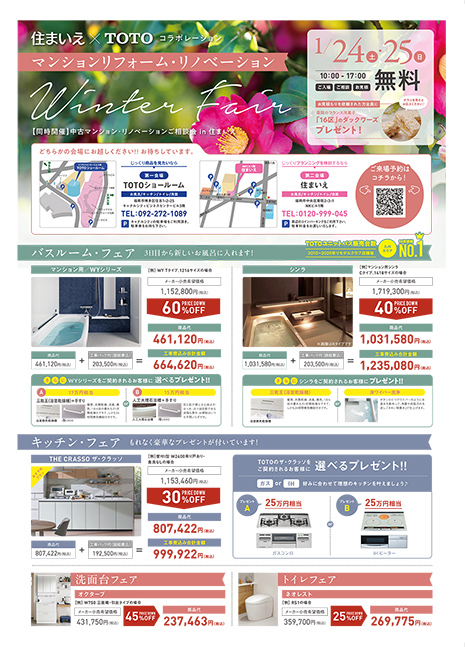 住まいえ×TOTOコラボレーション企画として、マンションリフォームリノベーションフェアを開催!住まいえ、TOTOショールーム各会場でお得なキャンペーンを実施します。