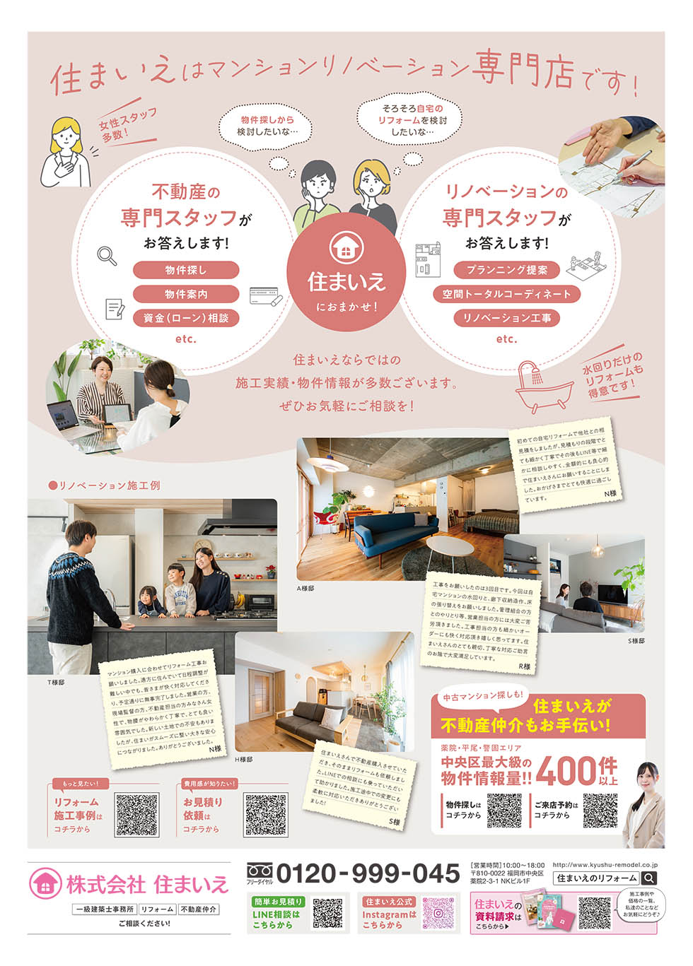 住まいえはリフォームだけでなく、不動産仲介も行っております!ペット可物件、リノベ済物件など条件はもちろん、リフォーム費も予算にいれた中古マンション探しも可能。理想の暮らしをトータルでサポートいたしますので、何でもご相談ください!