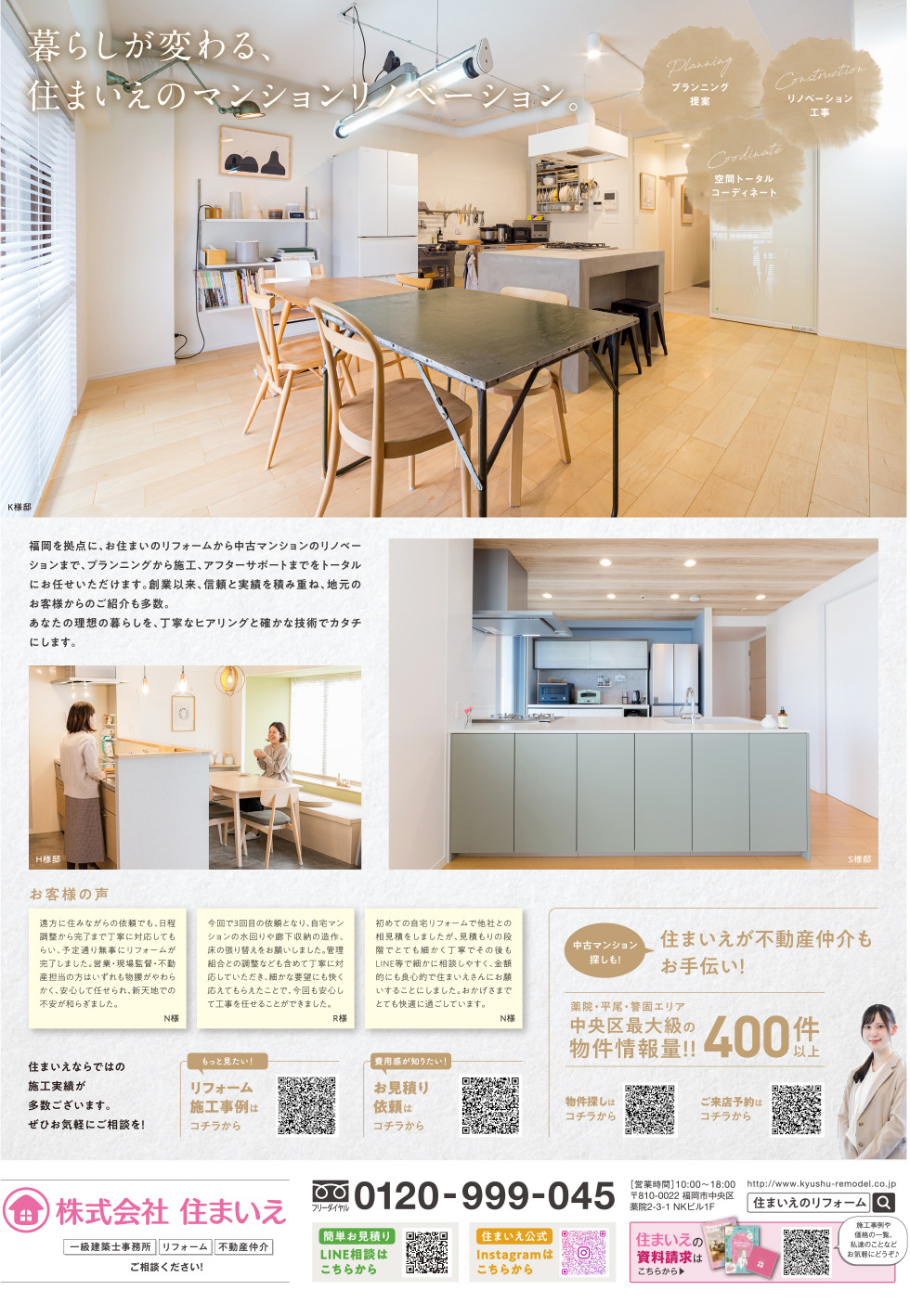 福岡を拠点に、お住まいのリフォームから中古マンションのリノベーションまで、プランニングから施工、アフターサポートまでをトータルにお任せいただけます。