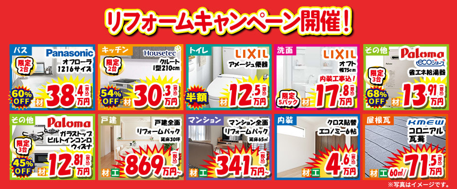 リフォームキャンペーンを開催します。今回のラインナップでは最大68%OFFのお得な商品もございます。リフォームをご検討の方はぜひご相談ください!
