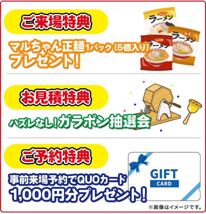 ご来場特典として「マルちゃん正麺1パック(5個入り)」をプレゼント!さらに、お見積りいただいた方には、ハズレなし!ガラポン抽選会を実施いたします。