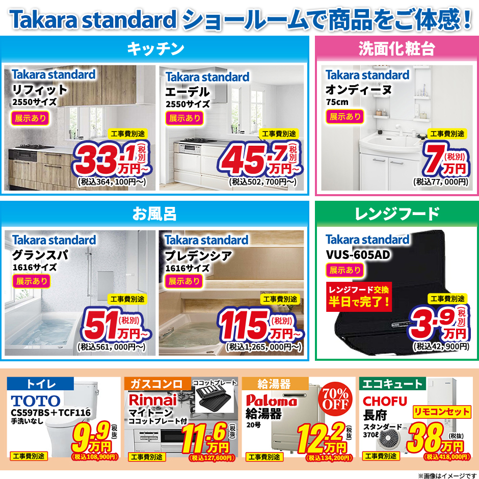 最大70%OFFの給湯器やココットプレート付のガスコンロなど、お得なリフォーム商品をご用意!エコキュートは460Lもご相談ください。お客様に合わせた給湯システムをご案内いたします。
