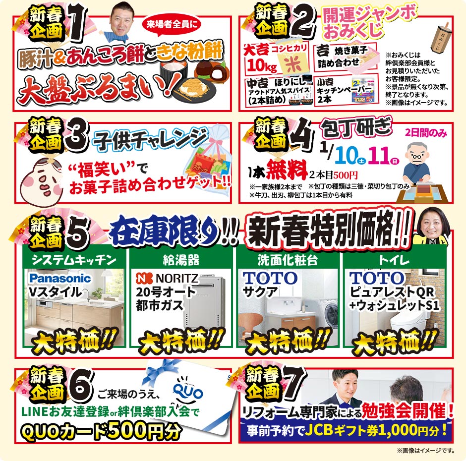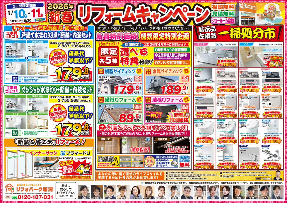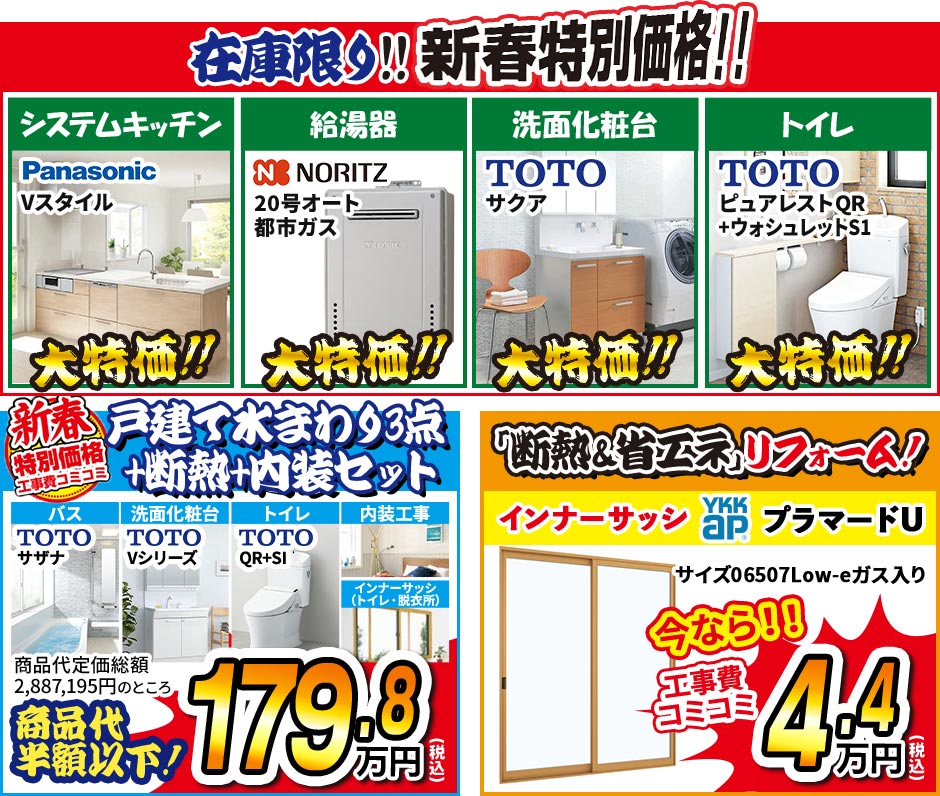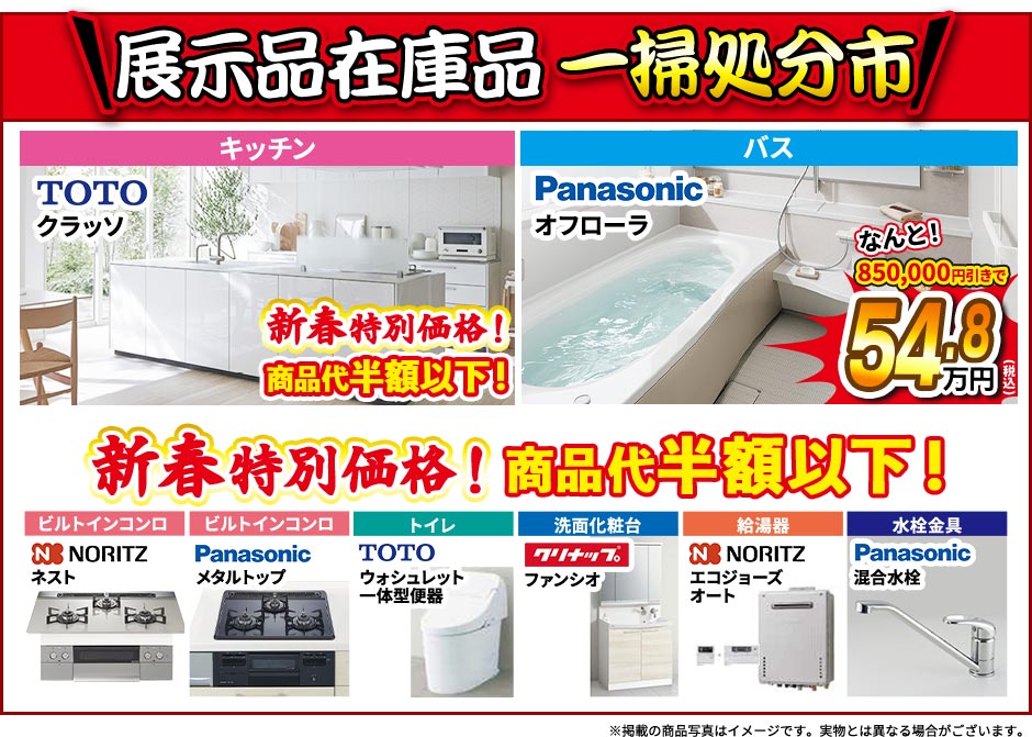 さらに洗面、トイレ、給湯器やコンロなど、台数限定ですべて半額以下のお得な展示品・在庫品一掃処分市を開催!リフォームをご検討の方はぜひご相談ください!