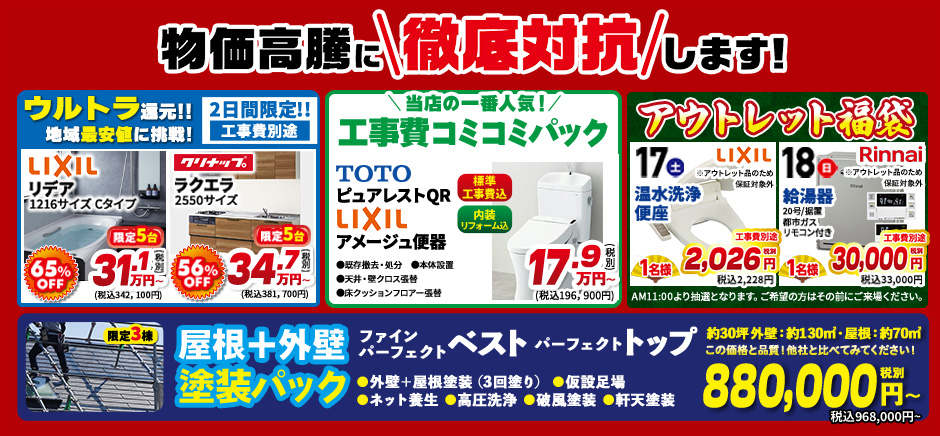 物価高騰に徹底対抗!地域最安値挑戦商品やお得な工事費コミコミパックなどオススメ商品が満載!