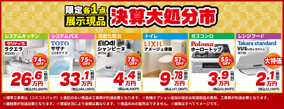 限定各1点のシステムバス、洗面化粧台、トイレなどお得な水まわり商品をご用意していますので、ぜひショールームで実物をご覧いただき、お早めにご相談ください!