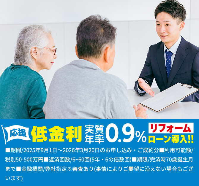 資金面が不安な方もご安心ください。リフォームのプロに直接ご相談いただけます!負担を抑えて始められる“低金利ローン”もご用意しています。