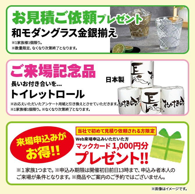 皆様への日頃の感謝を込めて、お得なご来店申込み・お見積特典・ご来場特典をご用意!豪華特典をご用意してお待ちしております。ぜひお気軽にお越しください!