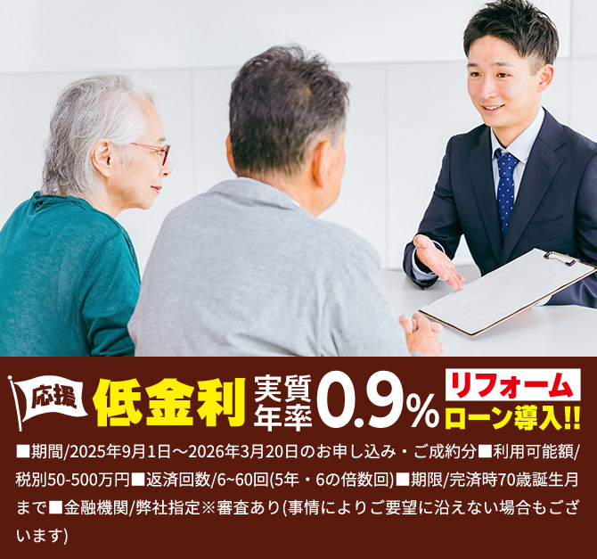 資金面が不安な方もご安心ください。リフォームのプロに直接ご相談いただけます!負担を抑えて始められる“低金利ローン”もご用意しています。